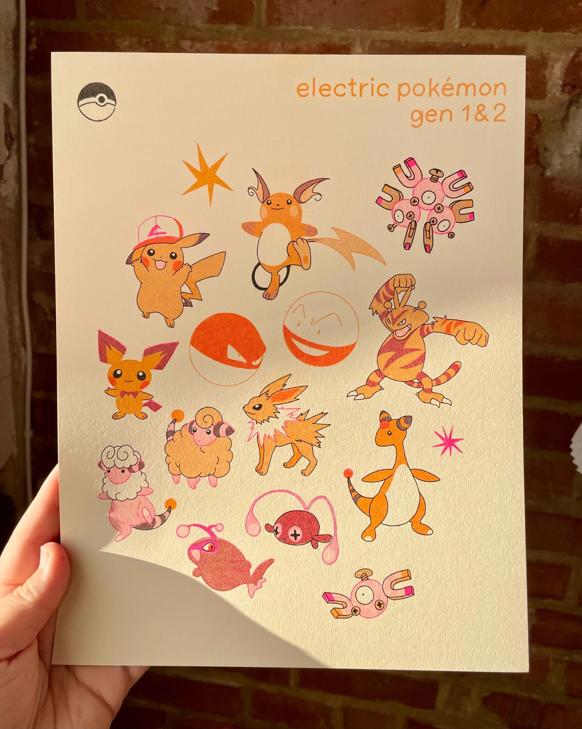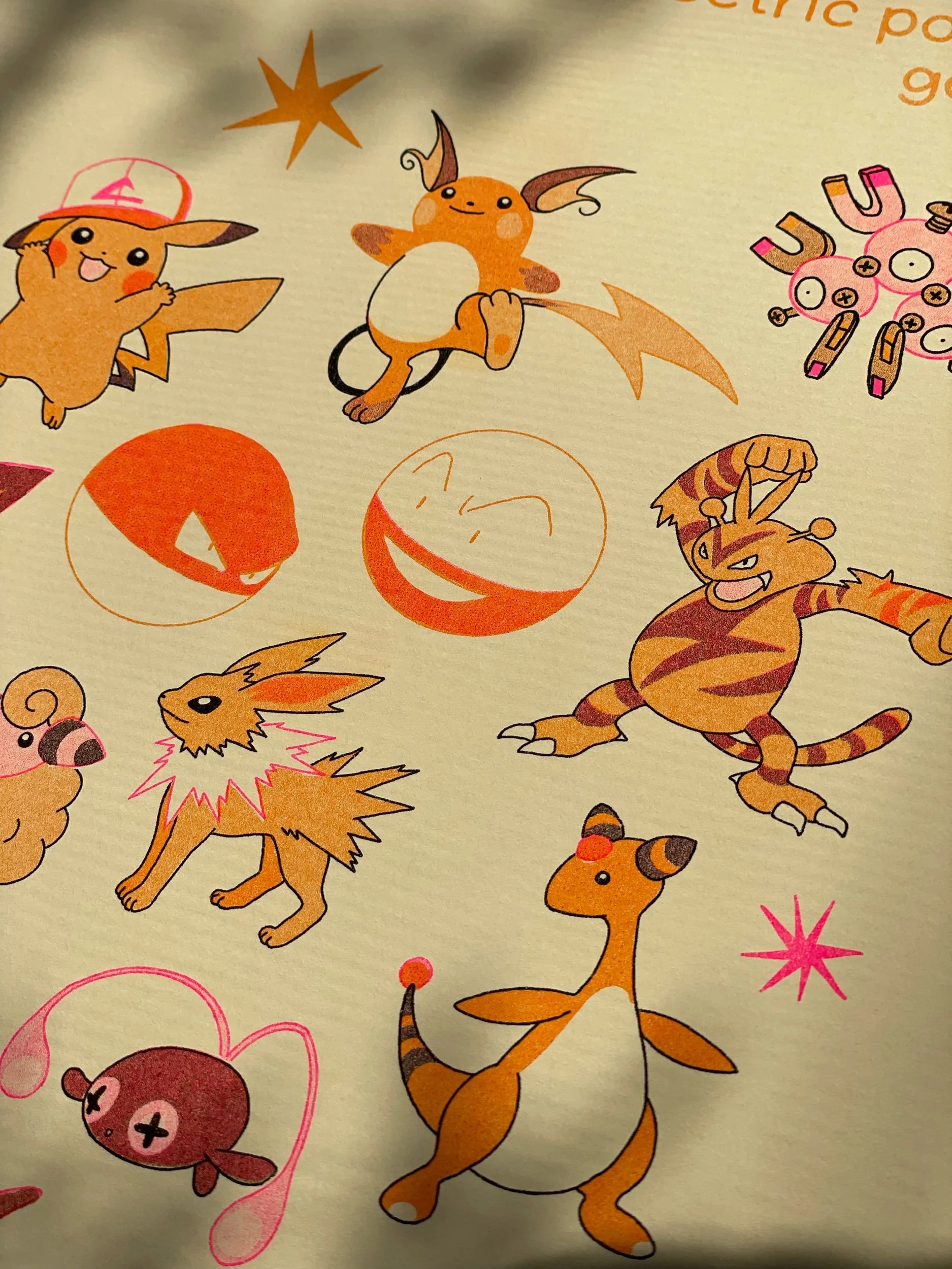 Risograph printed in melon, fluo pink, and black, printed at Swan Meadow on 8.5”x11 cardstock. A bunch of gen 1 and gen 2 electric type cuties!! <3
